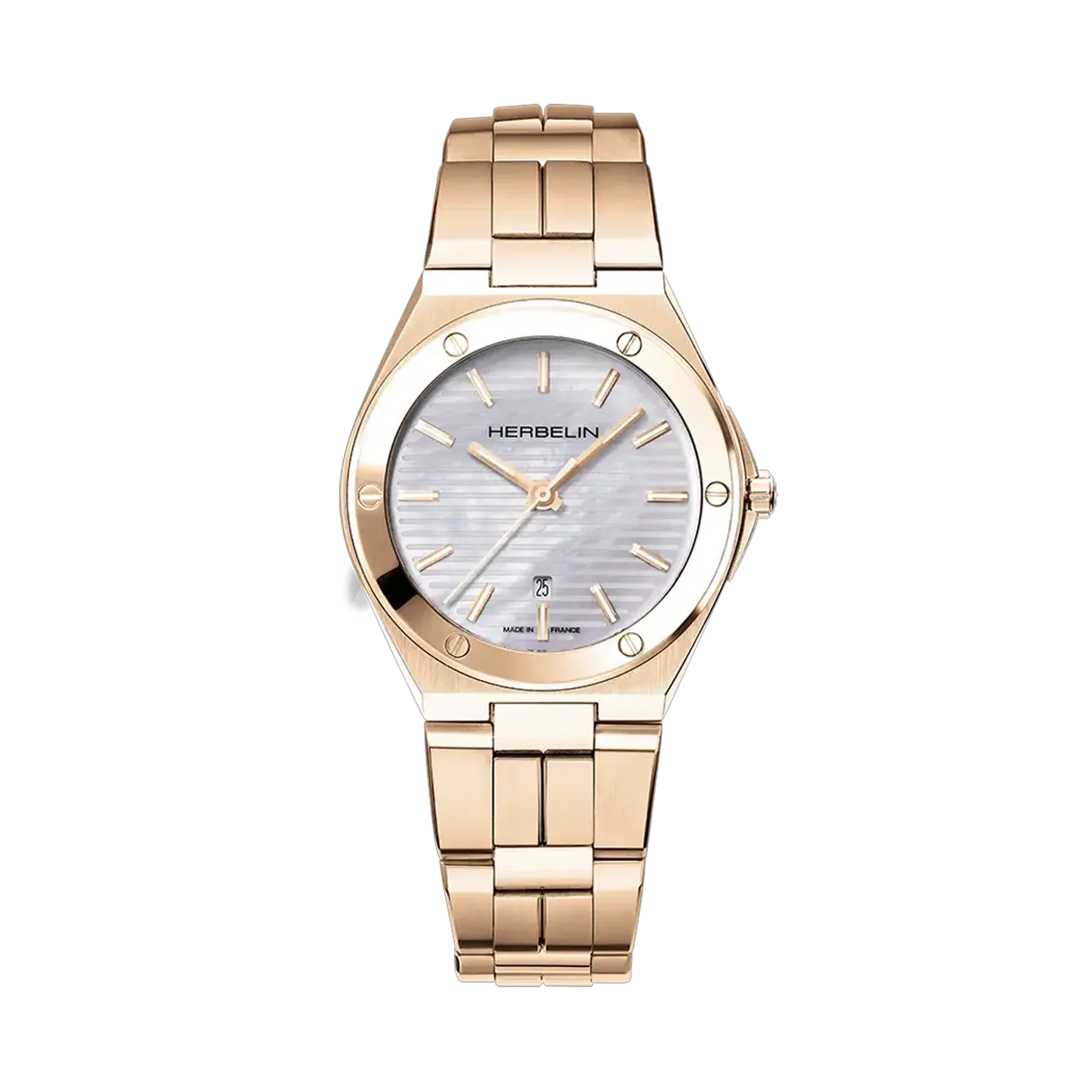 Cap Camarat er en av de mest populære seriene fra Herbelin, med klokker som passer både ham og henne. Modellene kjennetegnes av skruer i bezel og en stripete tallskive.