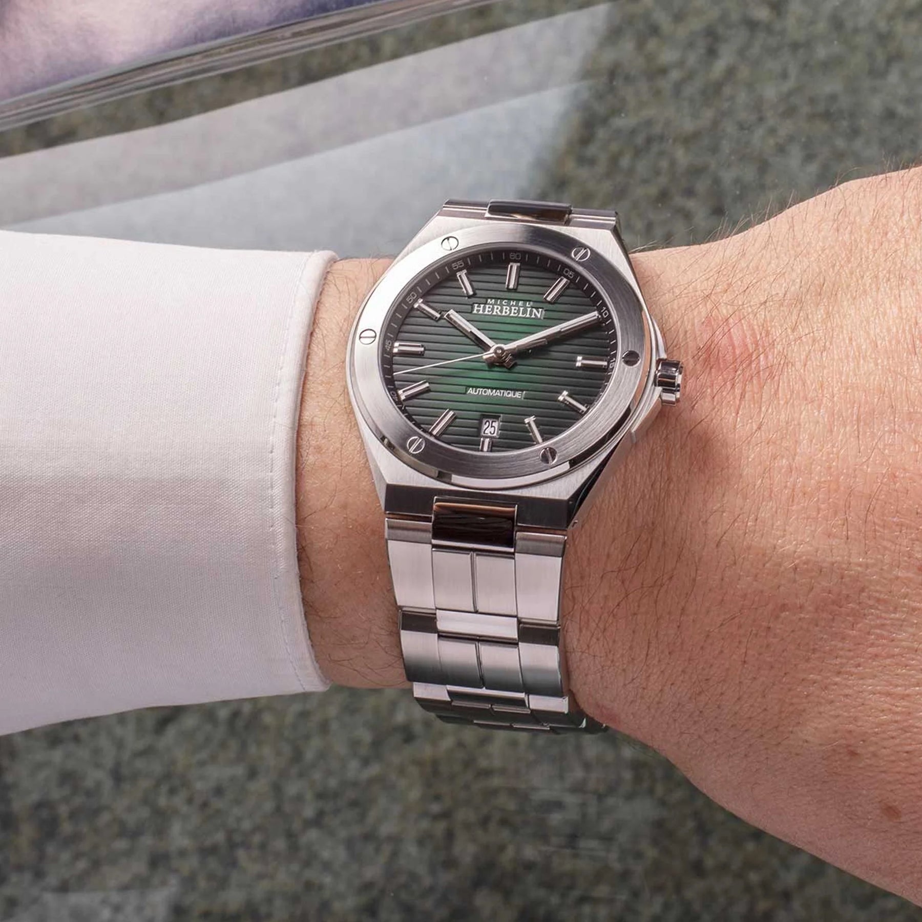 Cap Camarat er en av de mest populære seriene fra Herbelin, med klokker som passer både ham og henne. Modellene kjennetegnes av skruer i bezel og en stripete tallskive.